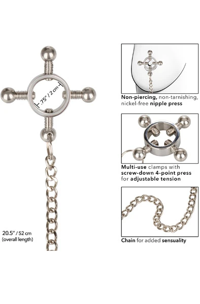 Legg til det lille ekstra på soverommet med 4-Point Nipple Press With Chain fra det populære merket Cal Exotics. Stram skruene til det nøyaktige trykket du ønsker, og trekk i kjedet for en tilfredsstillende følelse. Den fullt justerbare, skrubare 4-punkts-klemmen lar deg kontrollere trykket – stram eller løsne for en fullt tilpassbar nytelsesopplevelse. Disse klipsene og kjedet er laget av tungmetall som er nikkelfritt, noe som gjør dem kroppssikre.