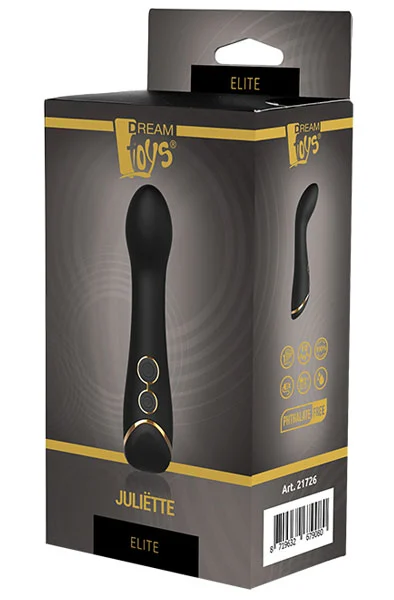 Juliette G-punktvibrator fra Elite-samlingen fra Dream Toys er en svart vibrator med stilige gullfargede aksenter og et fleksibelt, buet spiss som er perfekt for å stimulere G-punktet. Den kraftige motoren har 7 vibrasjonsmønstre og 3 hastigheter. Juliette-vibratoren er oppladbar med den medfølgende USB-pin-kabelen. Den er laget av silikon av høy kvalitet og ABS, IPX7 vanntett og kroppssikker, ftalatfri og latexfri. Vibratoren kan utføres med 2 knapper i bunnen av vibratoren: den øvre knappen for å slå vibratoren på/av, den nedre knappen for å slå på vibrasjonsprogrammet.