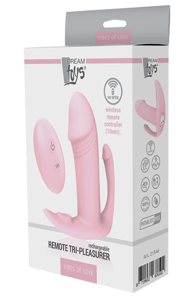 Tri-Pleasurer er en trepunktsvibrator som enkelt styres med en trådløs fjernkontroll. Vibrasjonene drives av en vibrerende ball i den penisformede akselen. Kulen kan fjernes og brukes separat.
