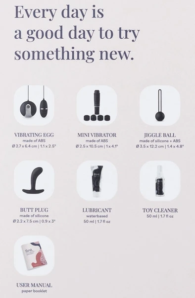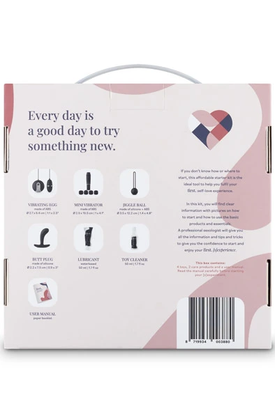 I esken finner du et vibrerende egg med fjernkontroll, en minivibrator med 4 forskjellige strukturerte hoder, en ball, en analplugg, vannbasert glidemiddel og en flaske lekerens. Alle lekene er laget av kroppssikre materialer og er enkle å bruke. Den omfattende og ærlig skrevne manualen (på engelsk) ble laget av en erfaren sexolog og er full av forklaringer, gjør og ikke må og vil gjøre deg trygg nok til å starte denne nye oppdagelsesreisen!