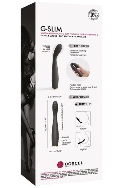 G-Slim fra det populære merket Marc Dorcel er en slank og fleksibel G-punkt vibrator designet med en fullt bøybar nakke. Dette gjør det lettere å få tilgang til og stimulere G-punktet.