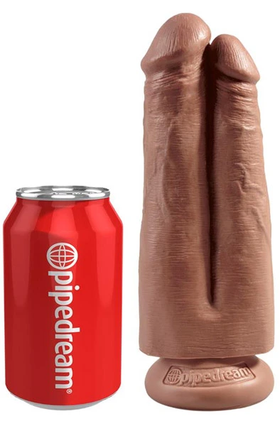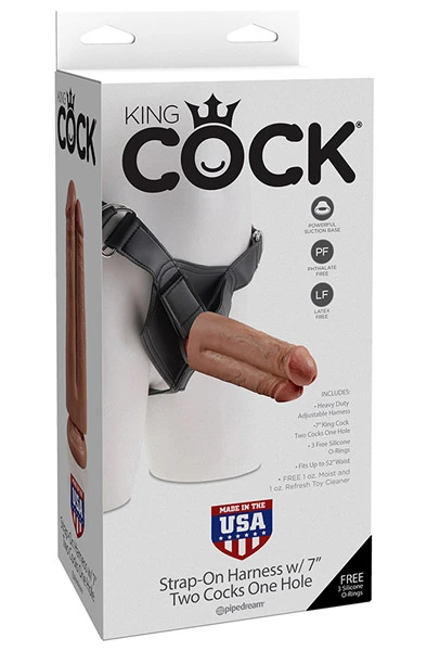 Tykk dildo med to peniser tett sammen, kombinert med en skikkelig strap-on sele for komfortabel bruk. Realistisk skulpturert for å både føle og se ut som et duplikat av den ekte varen. Produktet er eksklusivt håndlaget og fleksibelt nok for en ekte følelse hver gang.