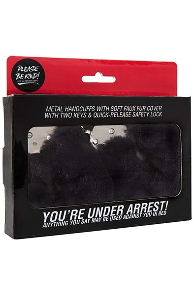 Metallhåndjern med myk svart fuskepels med to nøkler og en hurtigutløsende sikkerhetslås.