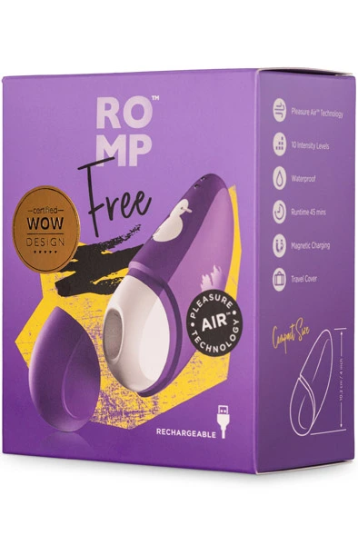 Hjemme eller på farten kan du ta med ROMP Free hvor du vil, takket være den diskrete størrelsen og den hygieniske reisehetten. En lettbetjent klitorisstimulator med den unike Pleasure Air™-teknologien, som stimulerer klitoris med subtilt lufttrykk og 10 intensitetsnivåer – og hjelper deg å utforske ny orgasmisk nytelse.