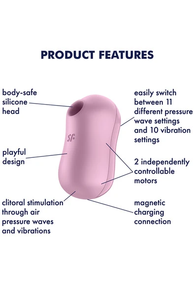Satisfyer Cotton Candy gir opphissende klitorisstimulering gjennom en kombinasjon av vibrasjoner og trykkbølger. To separat kontrollerbare motorer med 11 trykkbølgeintensiteter og 12 vibrasjonsprogrammer gir en mengde mulige kombinasjoner!