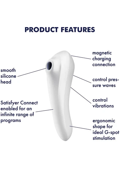 Satisfyer Dual Pleasure har flere ting å by på: Trykkbølgevibratoren kan ikke bare brukes som G-punktvibrator – den tilbyr også muligheten til appstyring med den gratis Satisfyer Connect App. Med et lett buet skaft av hudvennlig silikon kan nytelsesbringeren ikke bare stimulere G-punktet – den andre enden egner seg dessuten til klitorisstimulering og forkjæler perlen din med pulserende trykkbølger. Siden Dual Love har en vanntett (IPX7) overflate, kan den også fint brukes i dusjen eller i badekaret – dessuten er den enkel å rengjøre med varmt vann og en mild såpe. Dersom nytelsesbringeren skulle gå tom for kraft, kan de integrerte batteriene lades opp igjen med den medfølgende USB-ladekabelen.