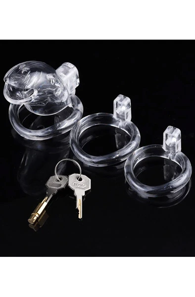 Dette settet består av et bur og tre ringer med forskjellige diametre. Den er laget av gjennomsiktig polykarbonat, som er veldig lett, sterk, slitesterk, hypoallergen og ftalatfri. Ikke la hengelåsen avskrekke deg – dette buret har en innebygd låseenhet som er skjult inne i selve penisburet. Utstyrt med en rekke ventilasjonshull og åpning for vannlating. Penisburet har en lengde på 7,5 cm og innvendig diameter 3,5 cm. Ringene måler 4 cm, 4,5 cm og 5 cm i innvendig diameter. Sett med 2 nøkler inkludert.