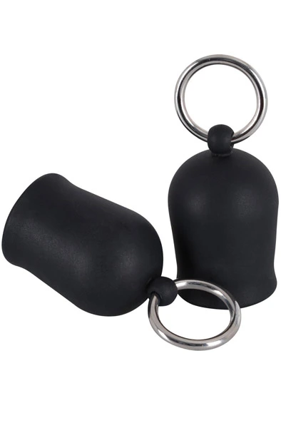To svarte brystvortesugere med metallring. Sugerne settes på brystvortene, når de trykkes sammen oppstår vakum. Innvendig diameter 2,1 cm. Materiale: Silikon.